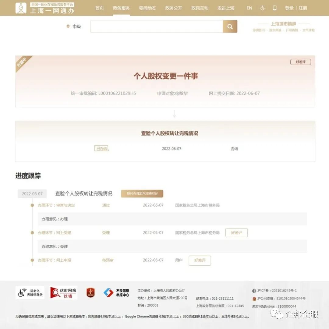 上海公司个人股权变更一件事流程有那些?2022 年 11 月 28 日,国家税务总局、上海市税务局和上海市市场监督管理局联合发布了《关于进一步做好股权变更登记个人所得税完税凭证查验服务工作的通告》(以下简称《通告》),将于 2022 年 12 月 20 日起施行。 《通告》开头明确提出,根据《中华人民共和国个人所得税法》和相关税收征管规定,上海市税务局与上海市市场监督管理局对个人转让股权个人所得税实施联合管理。同时,《股权转让所得个人所得税管理办法(试行)》(国家税务总局 2014 年第 67 号公告,以下简称“国家税务总局 67 号文”)也提到,个人的股权或股份是指自然人股东的股权或股份。 个人独资企业和合伙企业,不适用此政策 如前文所述,《通告》要求对个人转让股权实行先完成纳税登记、再进行股权变更登记的联合管理,其中个人转让的“股权”,指的是自然人股东转让其持有的的被投资企业的股权或股份。同时,根据国家税务总局 67 号文规定,被投资企业是指在中国境内成立的企业或组织,不包括个人独资企业和合伙企业。 纳税申报地点为“被投资企业所在地”主管税务机关 《通告》指出,办理纳税申报的地点应该在「被投资企业所在地」的主管税务机关,此条规定和国家税务总局 67 号文的第十九条规定相一致:“个人股权转让所得个人所得税以被投资企业所在地税务机关为主管税务关。” 搜索“上海一网通办” 然后再:搜索框:输入、“个人股权变更一件事” “个人股权变更一件事”需要法人登录,登录方式有两种:1.法人一证通;2.营业执照扫码登陆(需要确保电子营业执照中有电子印章,如没有请前往“电子营业执照”小程序申领)。 查阅办理须知完毕后,点击【已阅读并同意】按钮,进入下一步。 3.2、 信息查询及公司电子印章、电子证照调用授权书 出现二维码页面 使用手机支付宝或者微信扫描网页弹出的二维码,进行用户信息认证。验证成功后,新弹出授权委托书签章页面。 签署成功后,授权委托代办人数据则脱敏展示,确认没问题后可以点击下一步按钮。(若需要修改授权委托代办人信息则可点击【修改授权】按钮进行修改操作)。 3.3、 出让方与投资企业信息 以上页面信息选择完毕,可以点击“暂存”,点击下一步进入“转让与受让方信息”。 (1)受让方为“自然人”时,页面为: (2)受让方为“非自然人”时,页面为: 3.5、申报提交成功页 申请对象通过 “办件查询”搜索办件查看进度,地址为: https://zwdt.sh.gov.cn/zwdtSW/applySearch/applySearch.html 输入单位名称、统一审批编码、验证码即可查询。 (1)税务审批人员审批通过后,办件详情页会出现【继续办理股东变更登记】按钮。申请对象点击“继续办理股东变更登记”按钮,页面跳转市场局登记系统,申请人继续填写信息后提交。(具体流程详见附件)。 (2)当所有流程审批结束后,页面显示为: (一)选择变更(备案)事项 2、人工选择 (二)填报变更(备案)事项信息 根据您选定的变更(备案)事项,根据系统提示填相关信息 经营范围变更: (三)确认能否缴回纸质营业执照 您的办件可能需要换发纸质营业执照,需将您企业当前持有的纸质营业执照缴回登记机关。 系统将为您提供您企业当前持有的纸质营业执照正副本编号,请您核对确认,有关执照是否能全部缴回登记机关。 注:若您的执照营业执照遗失的,请通过国家企业信用信息公示系统(http://sh.gsxt.gov.cn)发布营业执照作废申明,并按网上登记(在线申报+在线预审+线下办理)流程办理业务。 (四)选择办理方式 按照全程网办(在线申报+在线预审+在线办理)流程办理。根据 系统自动生成的材料清单,上传企业依法形成的书面材料电子文件 (pdf格式电子文件),经登记机关预审通过后,有关人员根据系统。 提示远程完成电子签名,登记机关核准登记,完成办件。(涉及换发纸质营业执照的,通过现场或寄递方式完成执照换发。) 注:请通过扫描、拍照等方式,将您企业依法形成(并经有关人员书面签署)的书面材料转换为pdf格式电子文件上传。 按照网上登记(在线申报+在线预审+线下办理)流程办理。登记机关将对您填报的变更(备案)信息进行预审。预审通过的,请按照系统提供的材料清单,携带相关纸质材料原件,到登记机关现场办理。 (五)上传有关人员身份证件照片(全程网办) 注意: (六)上传材料(全程网办) 系统已根据您填报的变更(备案)信息,自动生成了申请表单,无需另行上传。请根据系统提示的材料清单,将您企业依法形成(并经有关人员书面签署)的书面材料转换为pdf格式电子文件上传。 (七)提交预审 点击“提交预审”按钮,您申报的信息(上传的材料)将提交登记机关预审。系统将提示您办件的预审排序,登记机关将尽快为您提供预审服务。 以上就是“个人股权变更一件事”操作流程,如果您对上海公司股权变更还有不了解的地方,欢迎咨询我们咨询我们。企邦企服将竭诚为您服务。。 企邦企服专业办理公司注册、公司变更、公司注销、银行开户、商标注册、代理记账等服务,企邦企服一站式 创业服务平台,让创业更简单。